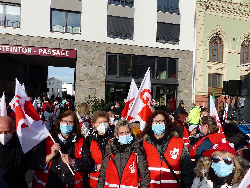 Die GEW Sachsen-Anhalt hat am Mittwoch, dem 10. November 2021 in Halle am Steintor-Varieté einen Warnstreik für die Tarifbeschäftigten im Geltungsbereich TV-L und TV Prakt-L durchgeführt. Ver.di und die GdP haben sich dem Aufruf angeschlossen. An der Demonstration beteiligten sich ca. 800 Lehrerinnen und Lehrer sowie Tarifbeschäftigte der MLU Halle-Wittenberg und der Hochschule Merseburg. Lautstark forderten sie auf der Kundgebung eine Verbesserung der Arbeitsbedingungen sowie mehr Gehalt ein: Eine Gehaltssteigerung von fünf Prozent, mindestens jedoch 150 Euro sind die Forderungen an die Arbeitgeber. Nach Informationen des Landesschulamtes folgten dem Streikaufruf Beschäftigte aus 400 Schulen des südlichen Sachsen-Anhalts.