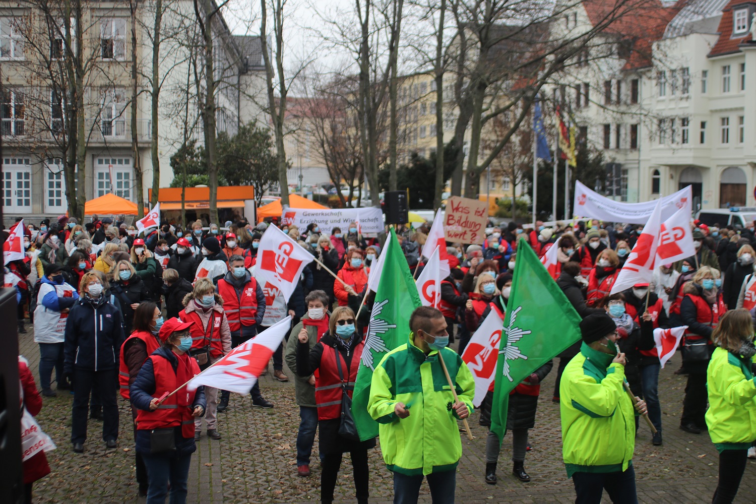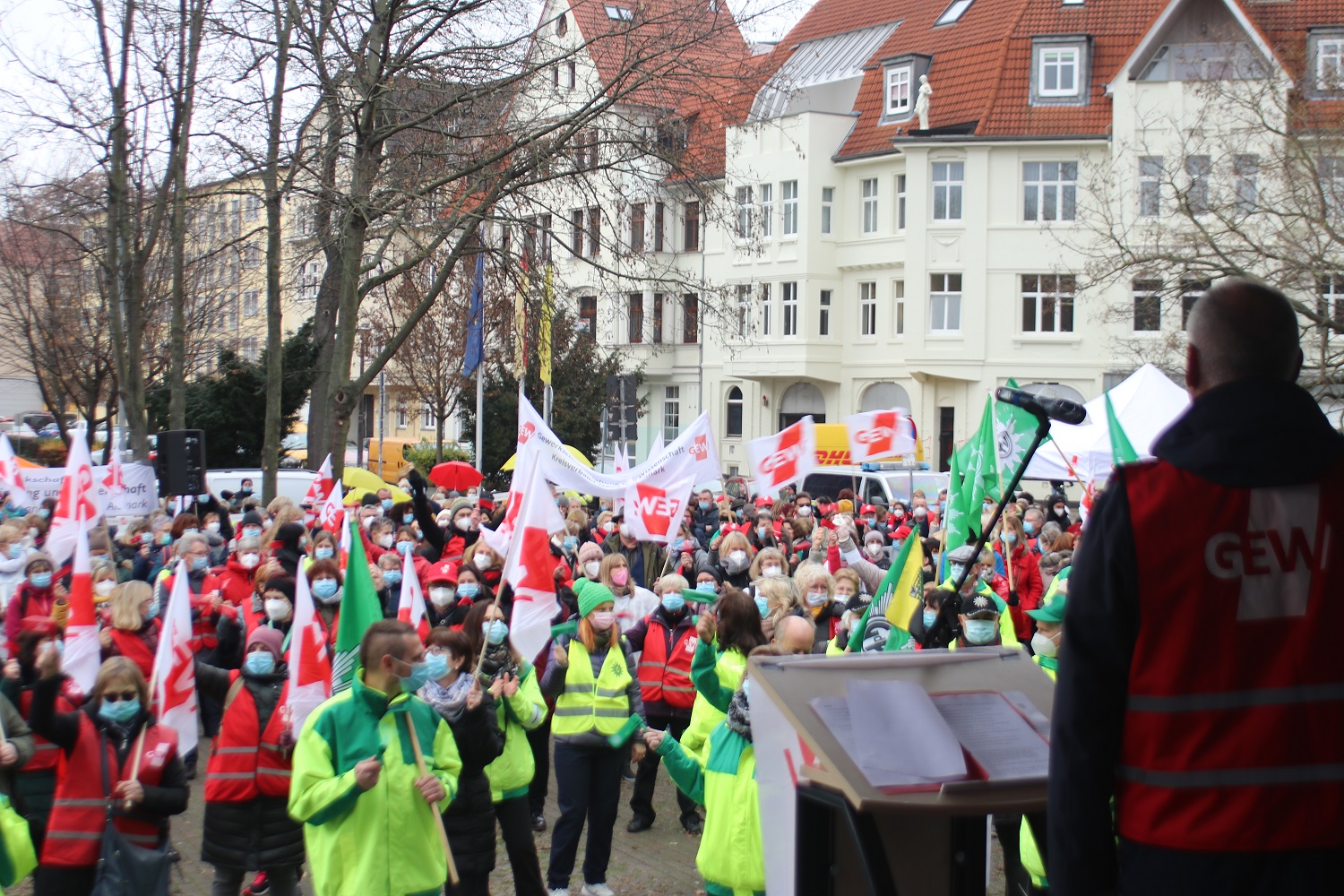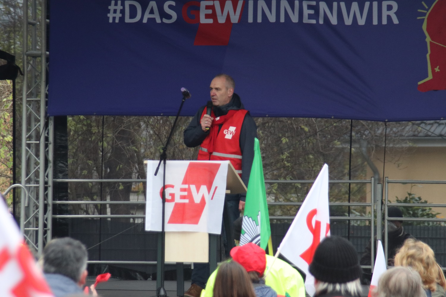 Die Gewerkschaft Erziehung und Wissenschaft Sachsen-Anhalt hatte am 23.11.2021 den nördlichen Teil des Landes zu einem Warnstreik unter schwierigen Bedingungen aufgrund der ständig steigenden Inzidenzzahlen aufgerufen. Während der Streikvorbereitungen hatten die Organsisator*innen des Streiks noch einmal verdeutlicht, dass ihnen die steigenden Inzidenzzahlen der letzten Tage sehr wohl bewusst sind, aber die Tarifgemeinschaft der Länder aufgrund ihres kompromisslosen und sturen Verhaltens gegenüber unseren Beschäftigten uns zwingt, eine härtere Vorgehensweise einzuschlagen. Deshalb greifen wir auf das Mittel des Warnstreiks zurück. Wir richteten in den Streiklokalen und während der Kundgebung unser Augenmerk immer auf die Gesundheit der Kolleg*innen, deshalb wies der Moderator zwischen den Redebeiträgen immer wieder auf die Einhaltung der Abstandsregeln bzw. das Tragen einer Mund-Nasen Bedeckung hin.