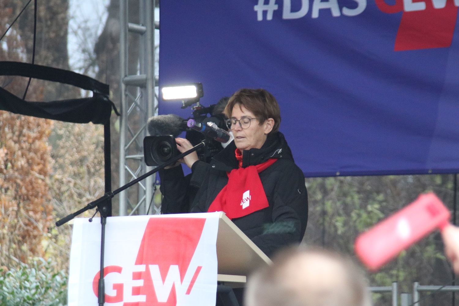 Auf der Kundgebung wurde auch noch einmal sehr deutlich, dass eine große Beschäftigtengruppe, nämlich die der Beamtinnen und Beamten, immer noch vom Streik ausgeschlossen wird. Deshalb gingen Grußworte auch an sie.