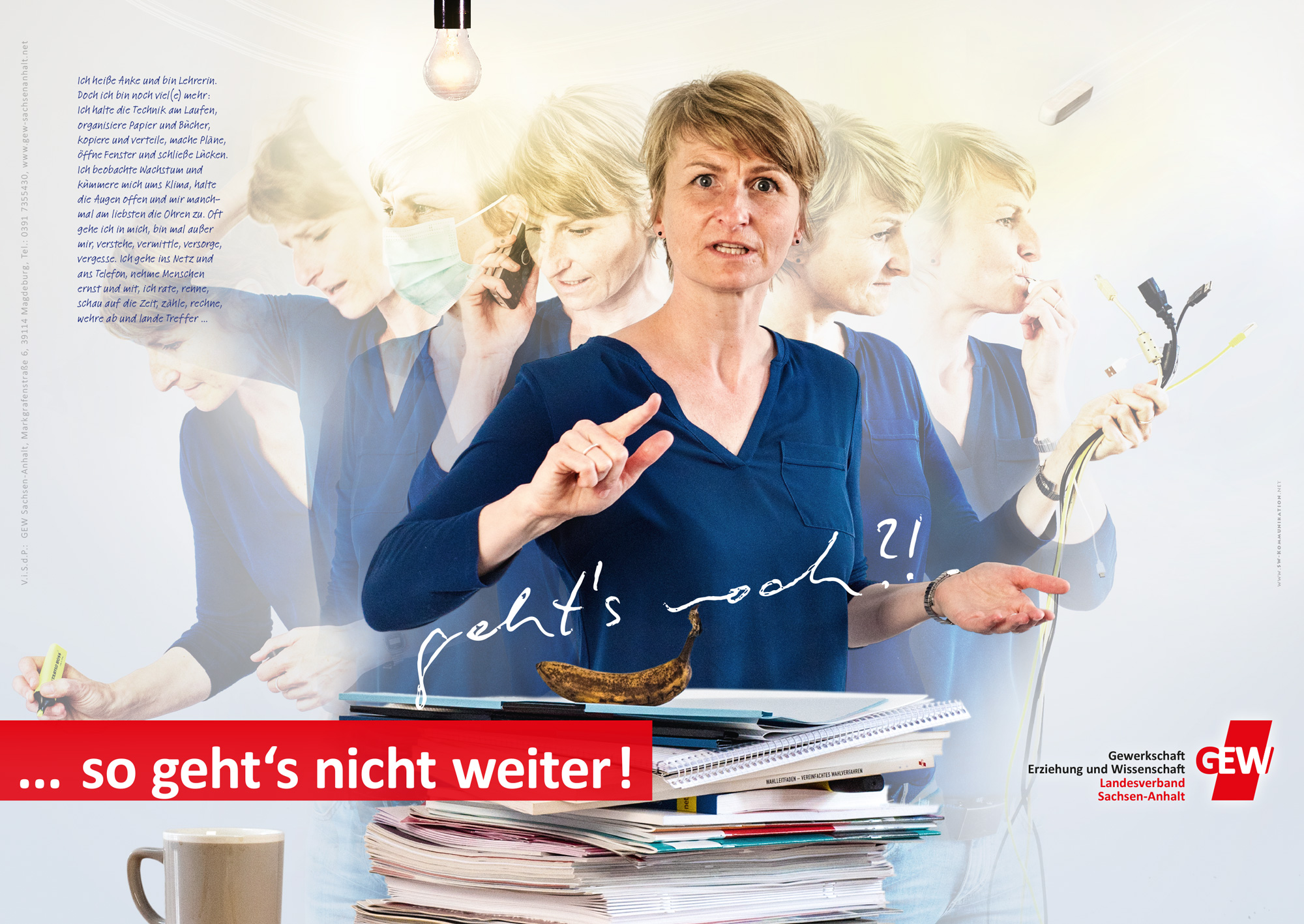 Unser Foto zeigt eure Kollegin Anke Prellwitz in einigen der vielen Situationen, denen sie als Lehrerin tagtäglich gewachsen sein muss. Das Bild könnte durchaus auch eine Inspiration sein, eurer Kreativität sind aber keine Grenzen gesetzt. Brint zum Ausdruck, dass ihr engagiert und innovativ seid und dass das nur mit guter Bezahlung einhergehen kann und lobende Worthülsen als alleinige Wertschätzung nicht ausreichen!